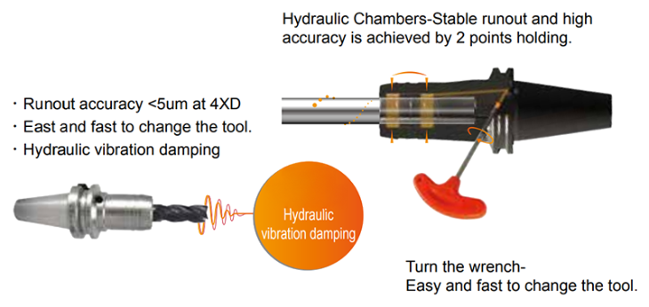 - Hydraulic Chambers-Stable runout and high accuracy is achieved by 2 points holding.