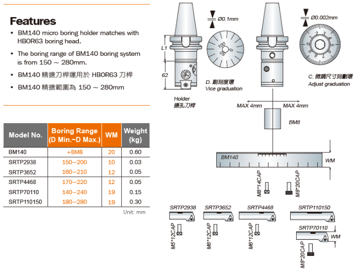 - 搭配SRTP刀片座时,BM140精搪范围为150 ~ 280mm。