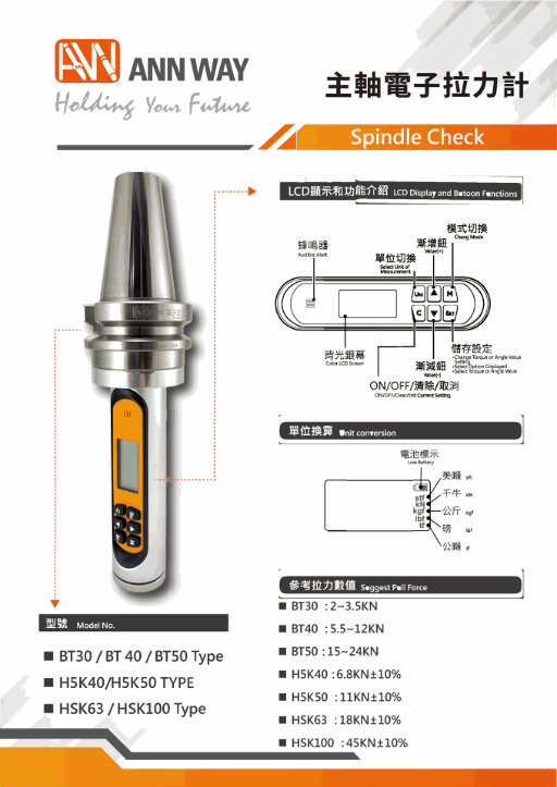 本產品採用高精度感測元件,搭配清晰LCD數位顯示螢幕,即時呈現量測數據,操作簡單直覺,可快速完成主軸拉力檢測。具備多種單位切換功能,滿足不同使用需求,為日常保養與預防性維護的重要檢測工具。